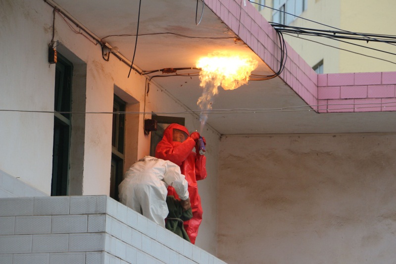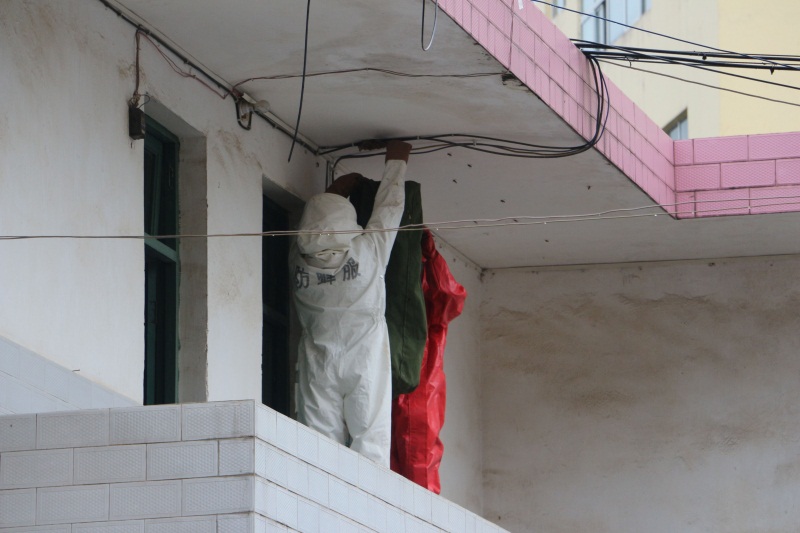 到达现场后,消防官兵发现,在食堂旁边宿舍楼的二楼屋檐下有一个排球大小的马蜂窝。了解情况后,挥员立即下令,让两名战士穿好防蜂服对马蜂窝进行摘除,然而位于近3米多高屋顶上的马蜂窝不得不让战士准备一张桌子。一切准备就绪后,一名官兵穿好防蜂服后进入前往摘除蜂窝,为了防止“愤怒”中的马蜂飞出去伤人,消防使用杀虫剂对马蜂窝表面的马蜂进行清理后,用事先准备好的帆布袋向上套去,随后用铲子向马蜂窝的根部铲去经过2分钟的紧张处置,马蜂窝被成功摘除。随后,消防手持杀虫剂再一次对马蜂窝筑巢处及外围马蜂进行了清理,确保漏网的马蜂不会返回筑巢。