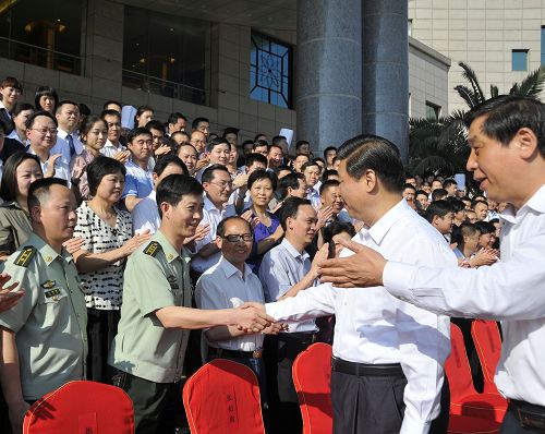 在合影前,习近平副主席与参加合影的第一排人员一一握手。王通翔同志是受到握手的第一位部队代表。在与王通翔同志握手时,习近平副主席问道:“你是军分区的吗?”。王通翔同志答:“报告首长,我是州公安消防支队政委王通翔。”,习近平副主席说:“好!辛苦了!”。随后继续与第一排的其他同志握手,握手结束即进行合影。