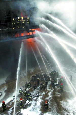 7月16日,中石油大连石化公司发生火灾,消防人员正在扑救。当日14时25分,中国石油大连石化公司厂区内1000万吨常减压蒸馏装置换热器发生泄漏,引发大火,该公司公告称无人员伤亡。中石油称监测表明对周边海域和大气未造成污染。去年7月16日,中石油大连保税区输油管爆炸起火。