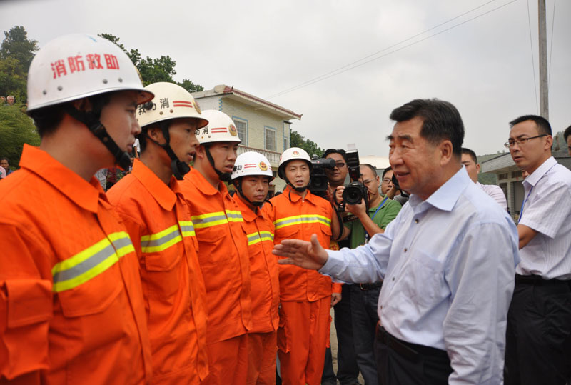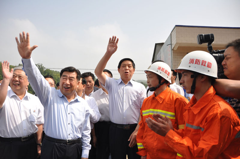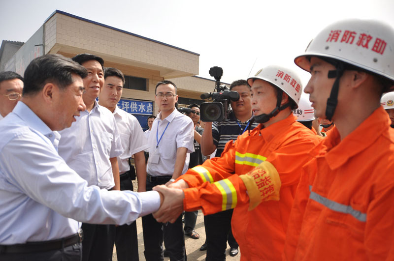 15时35分,回良玉副总理在鲁础营村犀牛坪组看望慰问抗旱救灾的村民后,再次来到消防官兵面前,深情地说到:“消防部队不仅是抗旱送水,包括各种灾害事故、抢险救援都需要你们,你们做得很好,我代表国务委员、公安部部长孟建柱感谢你们,你们辛苦了!”王从刚副支队长带领送水的全体消防官兵齐声答道:“感谢总理关心!”并向回良玉副总理保证:“请总理放心,我们一定完成好抗旱救灾任务!”