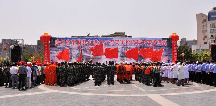 为切实增强群众防汛自救能力,减少汛期人员伤亡。4月27日,贵州省望谟县举办山洪泥石流灾害抢险救灾实战演练,省人民政府副省长、省防汛抗旱指挥部总指挥长禄智明,省水利厅厅长、省防汛抗旱指挥部副指挥长黎平,省消防总队党委委员、参谋长黄东亚,中共黔西南州委常委、州政府副州长周登涛,州政府副州长、州防汛抗旱指挥部指挥长、望谟县委书记邓家富及兴义军分区、州消防支队、武警支队和县委、县政府及各部门人员到场观摩指导,参演人员近千人。