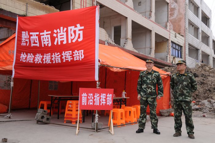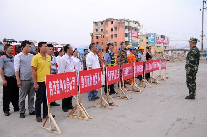 以上是贵州省综合应急救援总队、贵州省消防部队2013年春季练兵暨跨区域拉动地震救援(西片区)演练的精彩开幕。演练救援地点位于兴义市那坡立交桥施工(拆迁)区域。