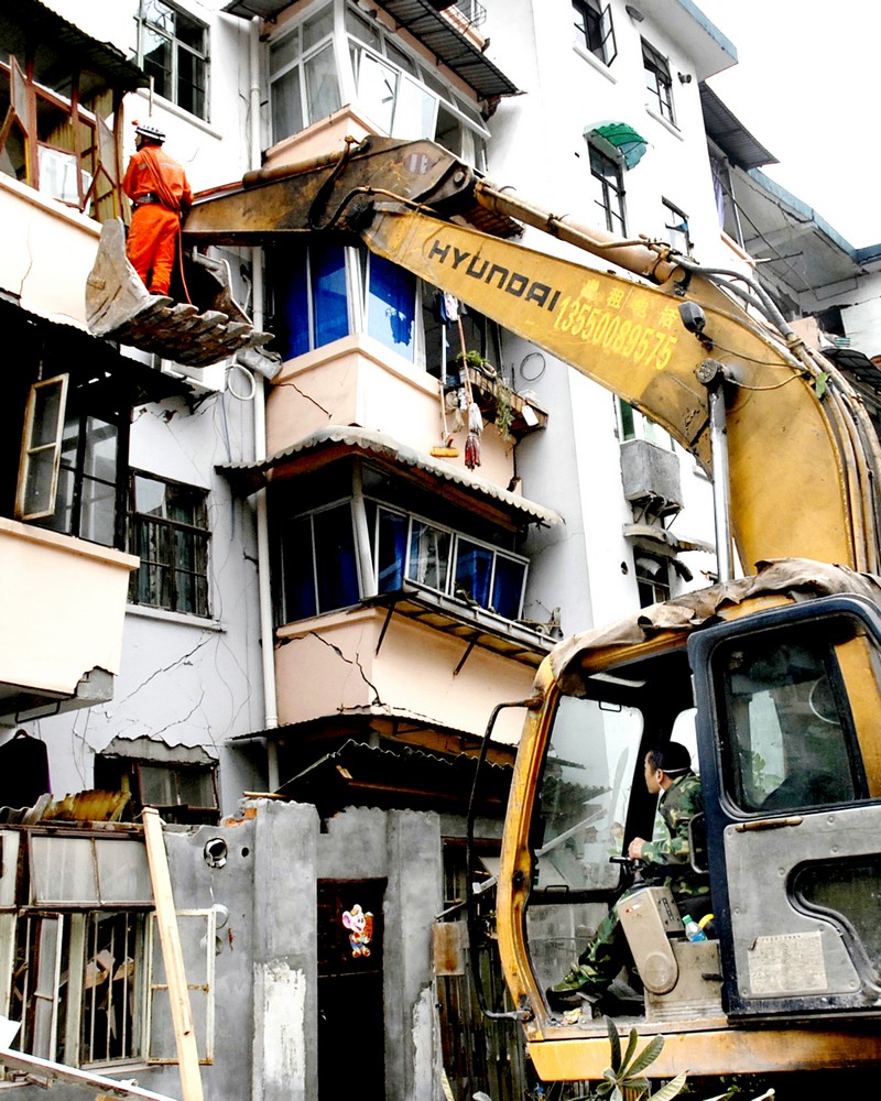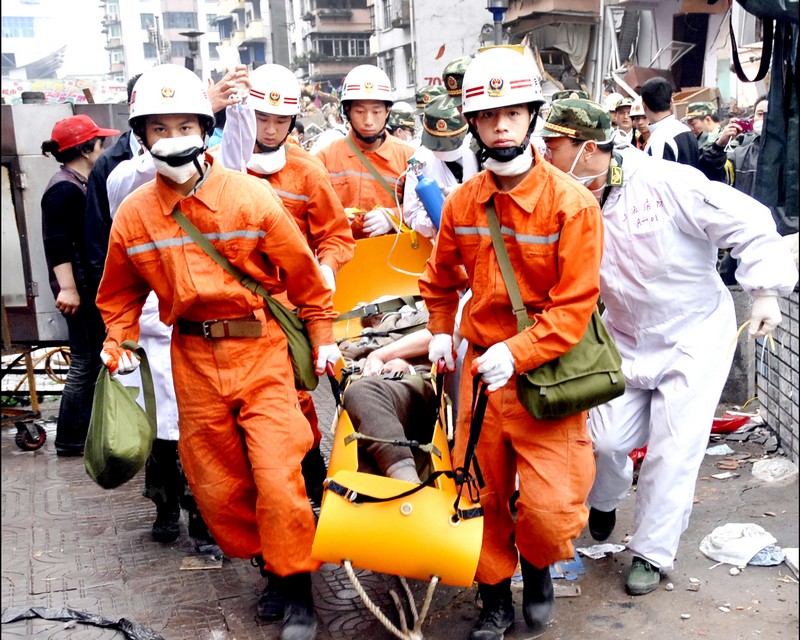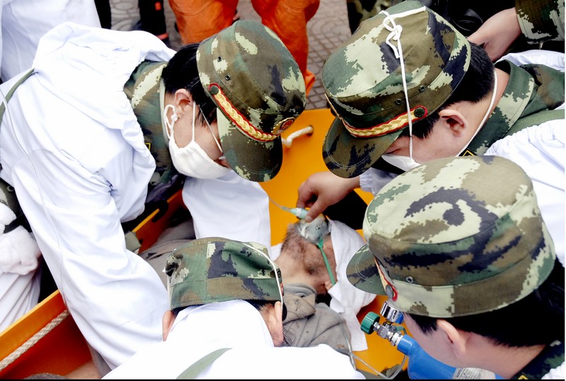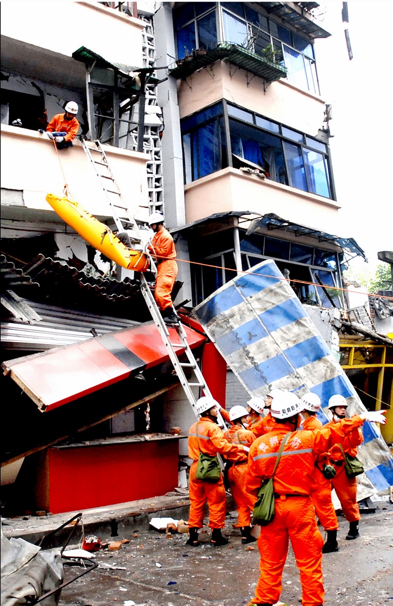 在“5·12”四川汶川大地震发生的第4天,2008年5月15日上午8时,贵州消防官兵在绵竹市汉旺镇东方汽轮机厂家属区703栋三单元三楼发现还有人员被困在危楼里。该楼另一半在地震中已倒塌了,仍立着的楼房在余震里随时都有可能再次发生倒塌。在这种情况下,为确保安全救人,贵州消防官兵调来挖掘机,利用挖掘机的挖斗将消防特勤队员送上三楼进行侦察。侦察员深入楼层内部,在二楼(原为三楼,地震后下塌了一层变为二楼)客厅中发现了一受伤的老大爷,已不能动弹,但还有微弱呼吸。由于正面救援不方便,特勤队员经过侦察发现借助后面阳台救人会更容易,指挥部就决定利用二节拉梯和使用消防多功能救援担架从后面阳台施救。经过官兵2个多小时的努力,5月15日10时17分,这位被困68小时的78岁老大爷张作栋被成功救出,图为消防医疗队员正在为这位大爷补氧。